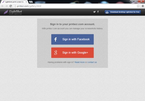 Tarayıcınız Lightshot galerinizi açmak için giriş yapmanızı isteyecektir. İstediğiniz herhangi bir sosyal hesabınızı kullanabilirsiniz.